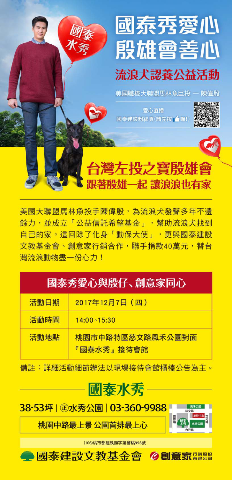 「國泰秀愛心 殷雄會善心 流浪犬認養公益活動」將於127(四)1400在「國泰水秀」展現愛心嚕!#國泰建設粉絲頁有直播喔!!